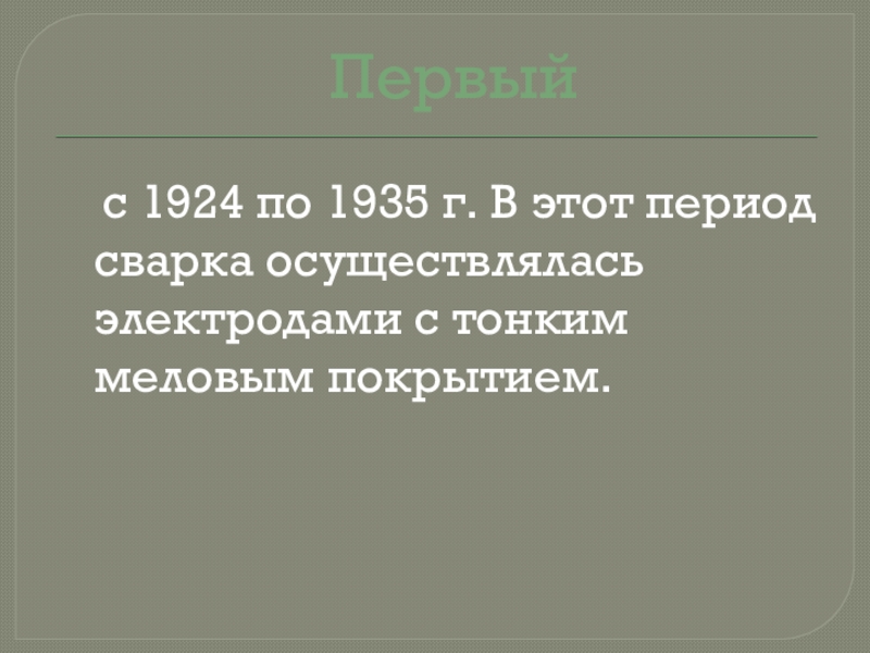 Первый  с 1924 по 1935 г. В этот период сварка осуществлялась электродами с тонким меловым