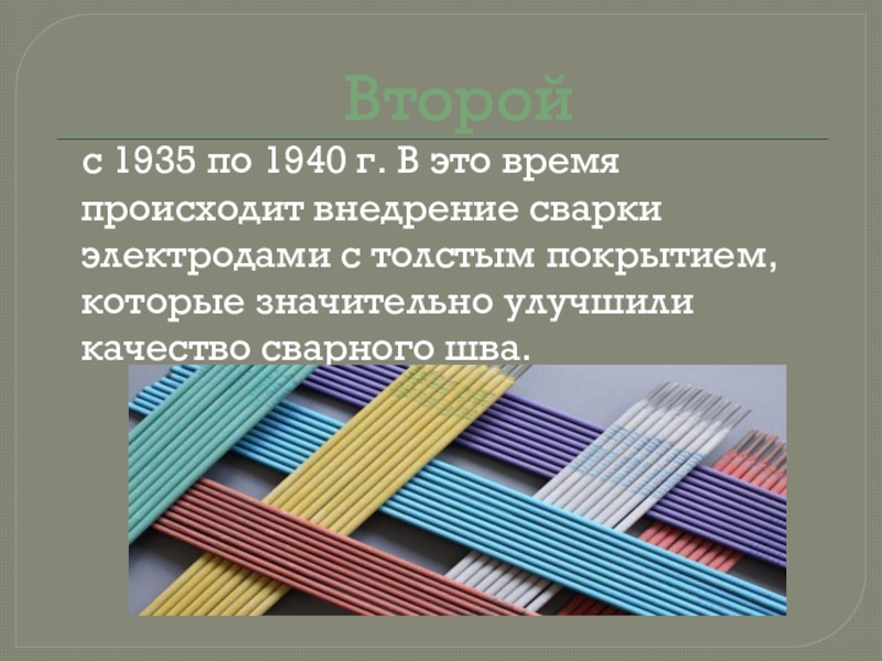Второй  с 1935 по 1940 г. В это время происходит внедрение сварки электродами с