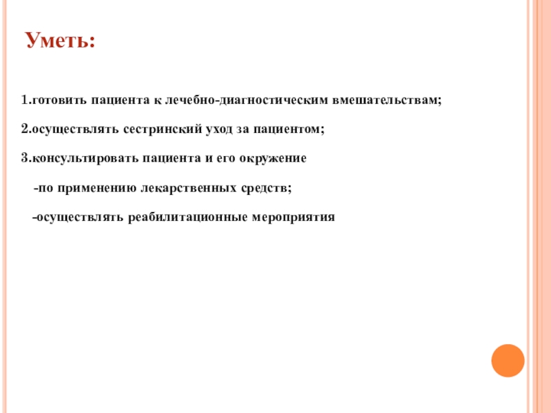 1.готовить пациента к лечебно-диагностическим вмешательствам;