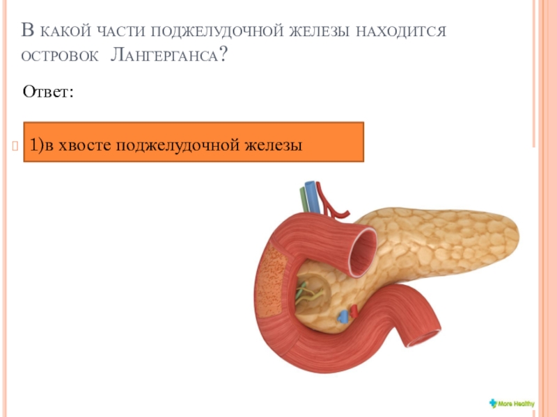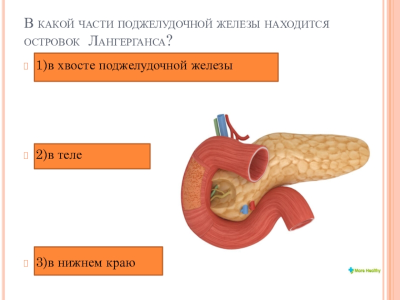Слайд 50В какой части поджелудочной железы находится островок Лангерганса?