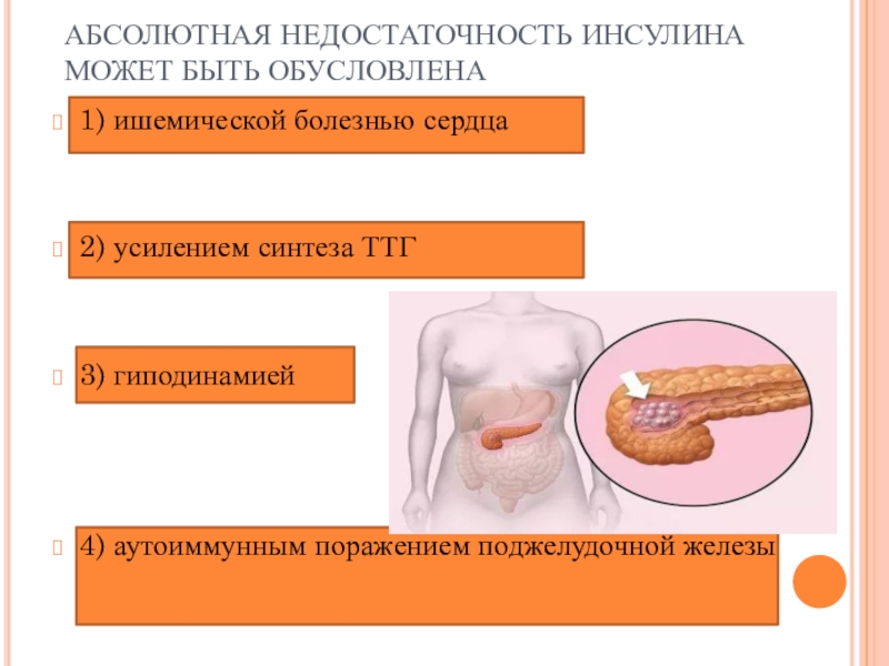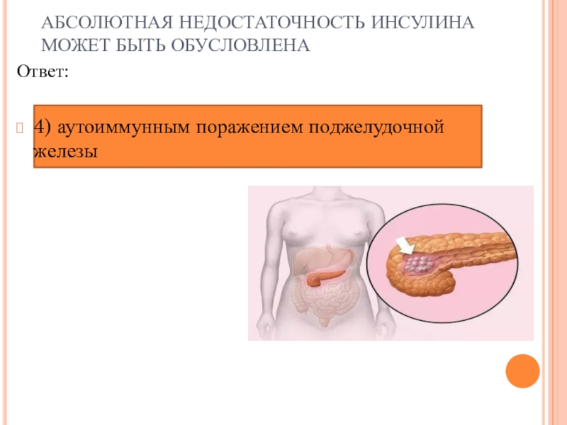 Слайд 10АБСОЛЮТНАЯ НЕДОСТАТОЧНОСТЬ ИНСУЛИНА МОЖЕТ БЫТЬ ОБУСЛОВЛЕНА
