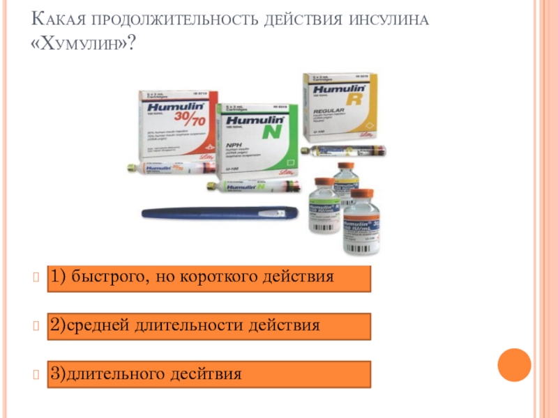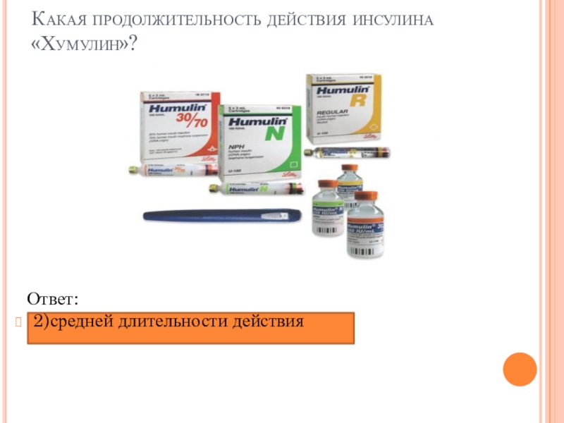 Слайд 33Какая продолжительность действия инсулина «Хумулин»?