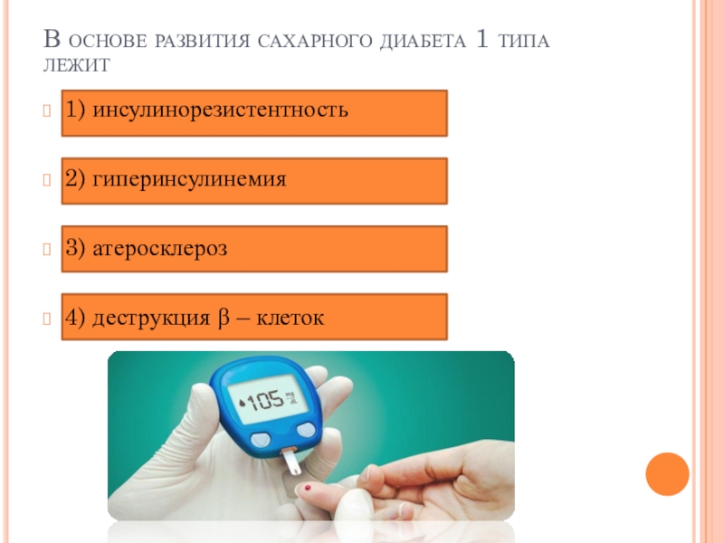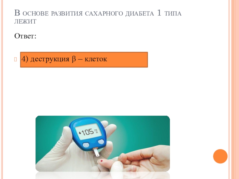 Слайд 8В основе развития сахарного диабета 1 типа лежит