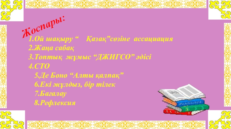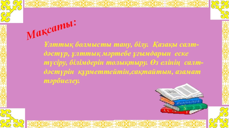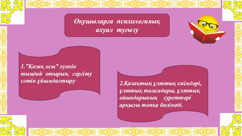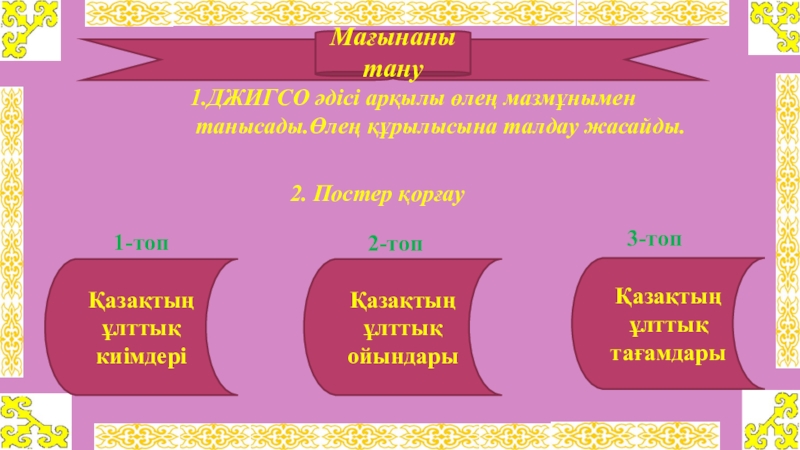 2.Қазақтың ұлттық киімдері, ұлттық тағамдары, ұлттық ойындарының суреттері арқылы топқа бөлінеді.