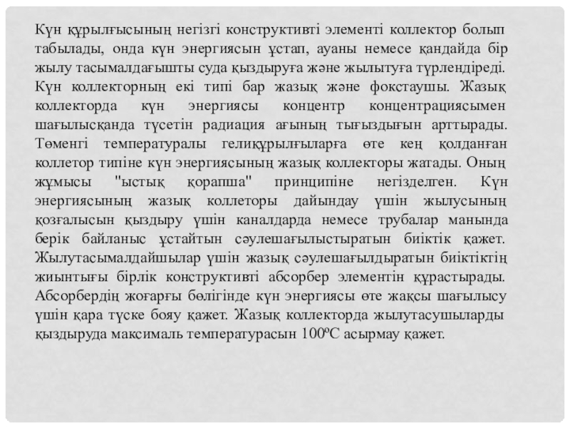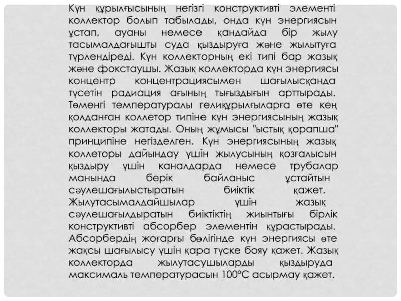 Слайд 10Күн құрылғысының негізгі конструктивті элементі коллектор болып табылады, онда күн энергиясын