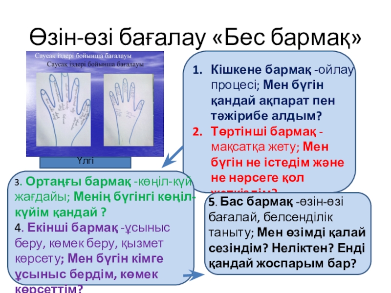 5. Бас бармақ -өзін-өзі бағалай, белсенділік таныту; Мен өзімді қалай сезіндім? Неліктен? Енді қандай жоспарым бар?
