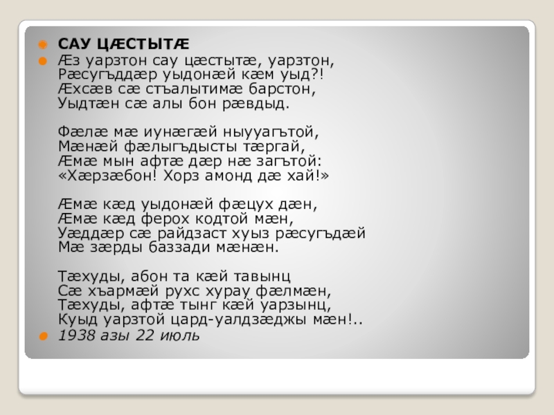 Слайд 4ÆЛВÆСТ ХЪУЫДЫТÆ УАРЗОНДЗИНАДЫ ТЫХХÆЙ