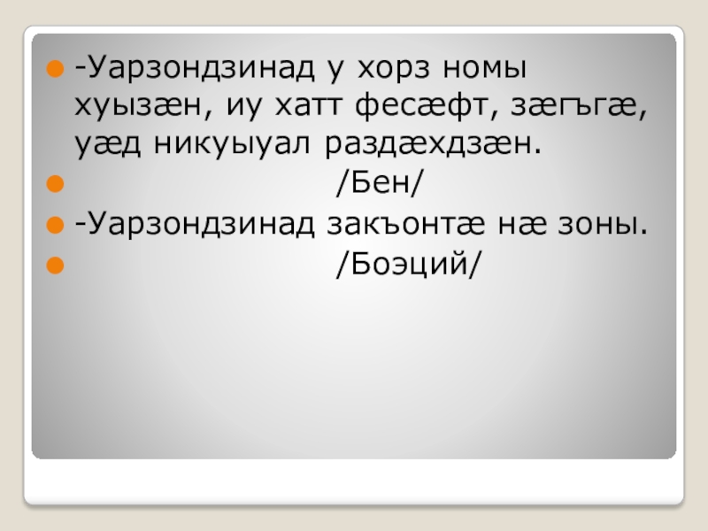 -Уарзондзинад у хорз номы хуызæн, иу хатт фесæфт, зæгъгæ, уæд никуыуал раздæхдзæн.								/Бен/-Уарзондзинад закъонтæ нæ зоны.								/Боэций/