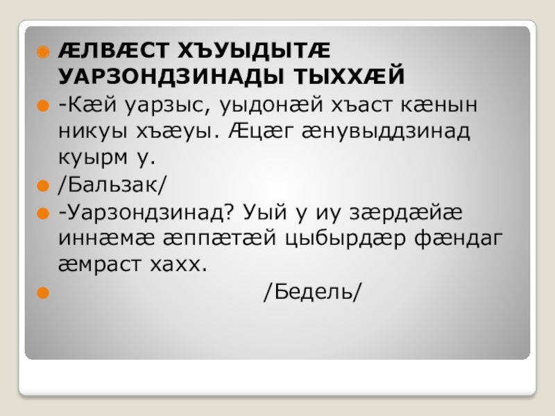 ÆЛВÆСТ ХЪУЫДЫТÆ УАРЗОНДЗИНАДЫ ТЫХХÆЙ-Кæй уарзыс, уыдонæй хъаст кæнын никуы хъæуы. Æцæг æнувыддзинад куырм у.						/Бальзак/-Уарзондзинад? Уый у иу