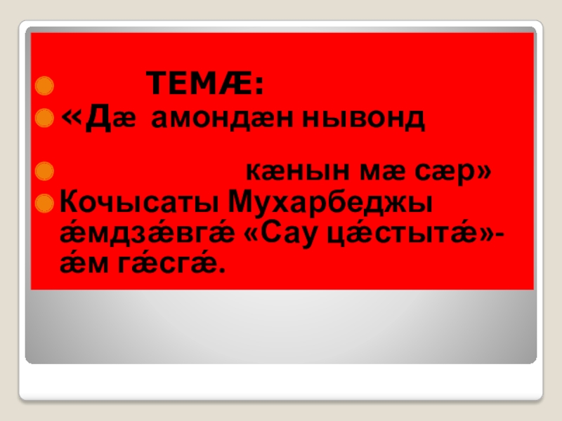 ТЕМÆ:«Дæ амондæн нывонд кæнын мæ сæр»Кочысаты Мухарбеджы ǽмдзǽвгǽ «Сау цǽстытǽ»-ǽм гǽсгǽ.