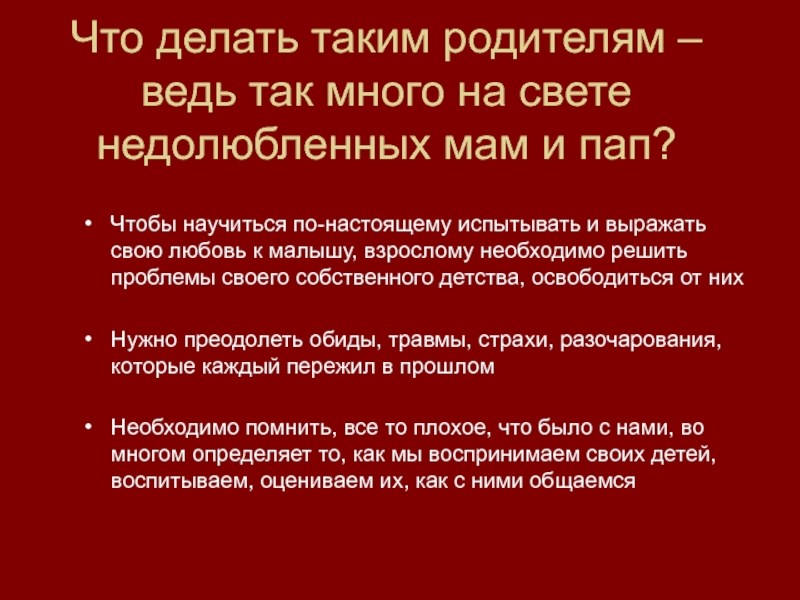 Чтобы научиться по-настоящему испытывать и выражать свою любовь к малышу, взрослому необходимо решить проблемы своего собственного детства, освободиться от них