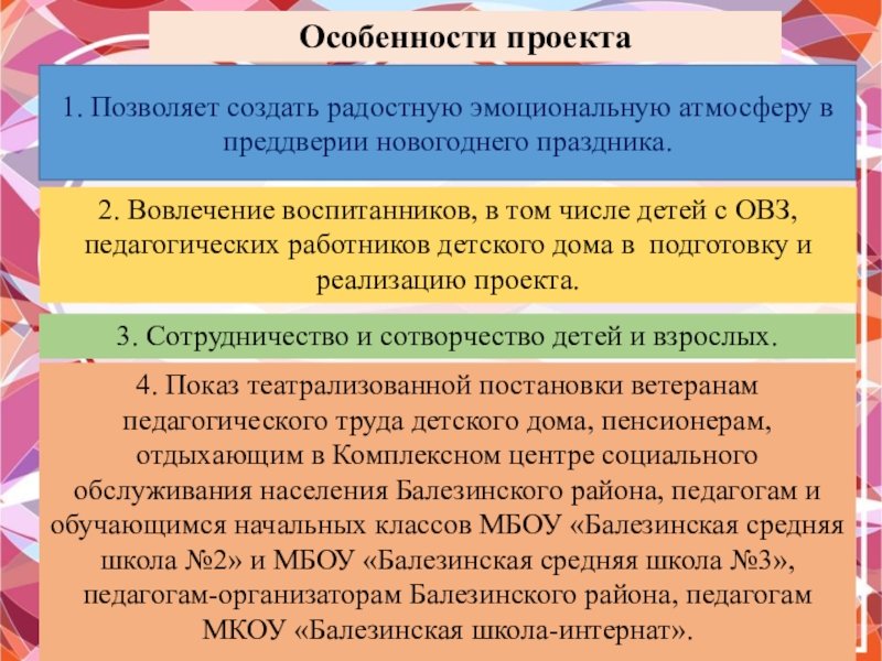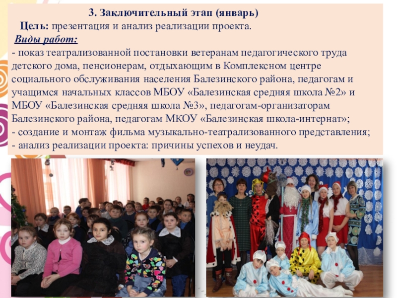 4. Показ театрализованной постановки ветеранам педагогического труда детского дома, пенсионерам, отдыхающим в Комплексном центре социального обслуживания населения Балезинского района, педагогам и обучающимся начальных классов МБОУ «Балезинская средняя школа №2» и МБОУ «Балезинская средняя школа №3», педагогам-организаторам Балезинского района, педагогам МКОУ «Балезинская школа-интернат».
