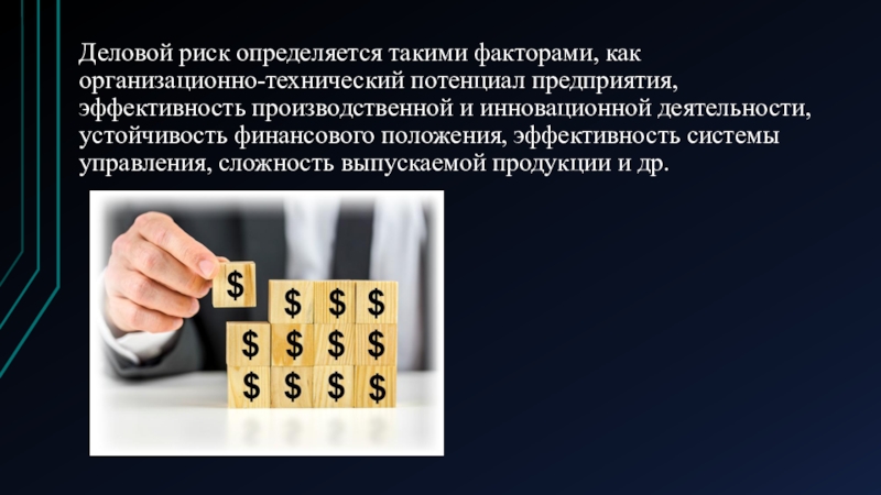 Слайд 11Деловой риск определяется такими факторами, как организационно-технический потенциал предприятия, эффективность производственной