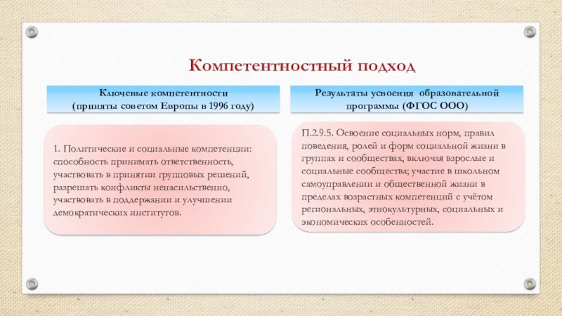компетенции: способность принимать ответственность, участвовать в принятии групповых решений, разрешать конфликты ненасильственно, участвовать в поддержании и улучшении демократических институтов.