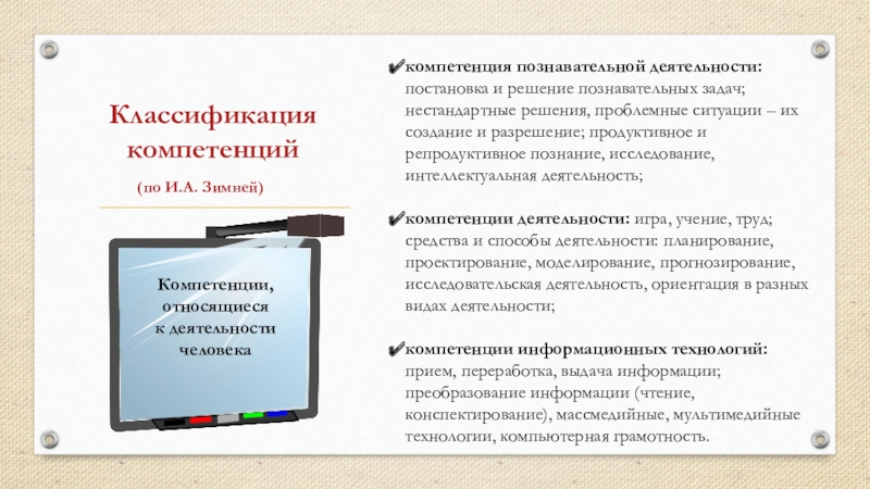 компетенции информационных технологий: прием, переработка, выдача информации; преобразование информации (чтение, конспектирование), массмедийные, мультимедийные технологии, компьютерная грамотность.