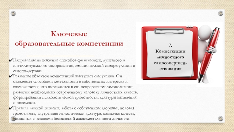 Реальным объектом компетенций выступает сам ученик. Он овладевает способами деятельности в собственных интересах и возможностях, что выражаются в его непрерывном самопознании, развитии необходимых современному человеку личностных качеств, формировании психологической грамотности, культуры мышления и поведения.