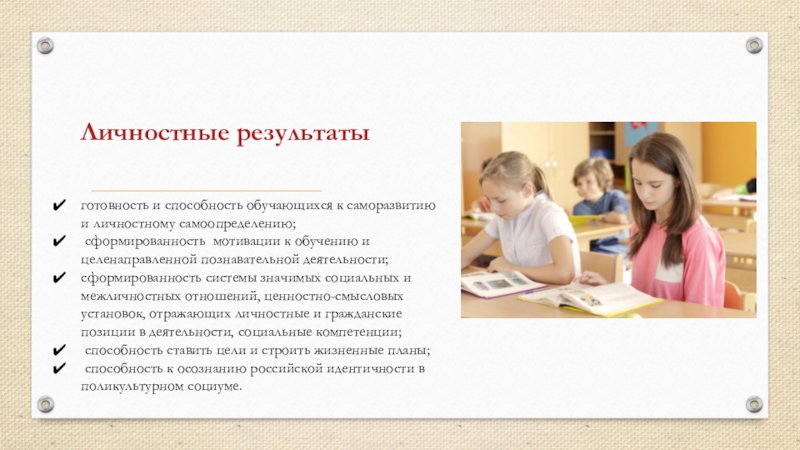 сформированность системы значимых социальных и межличностных отношений, ценностно-смысловых установок, отражающих личностные и гражданские позиции в деятельности, социальные компетенции;