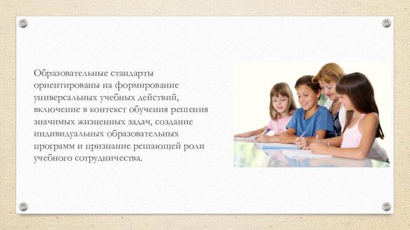 Слайд 8Образовательные стандарты ориентированы на формирование универсальных учебных действий, включение в контекст