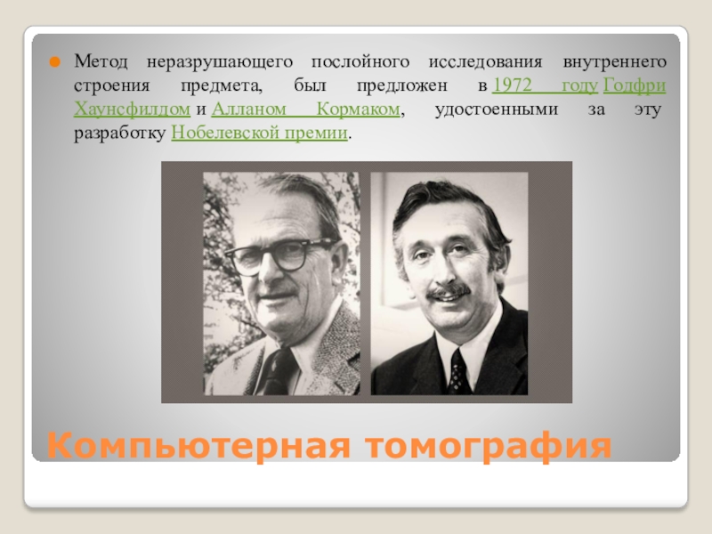 в 1972 году Годфри Хаунсфилдом и Алланом Кормаком, удостоенными за эту разработку Нобелевской премии.