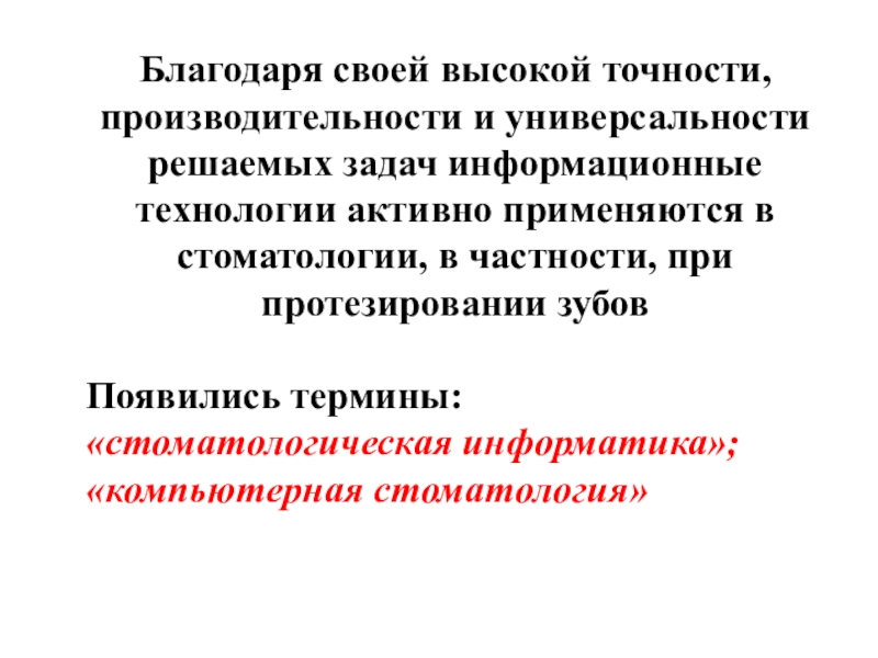 Благодаря своей высокой точности, производительности и универсальности решаемых задач информационные технологии активно применяются в стоматологии, в частности, при протезировании зубов Появились термины: «стоматологическая информатика»; «компьютерная стоматология»