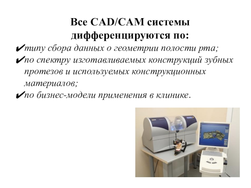 Все CAD/CAM системы дифференцируются по:типу сбора данных о геометрии полости рта;по спектру изготавливаемых конструкций зубных протезов и