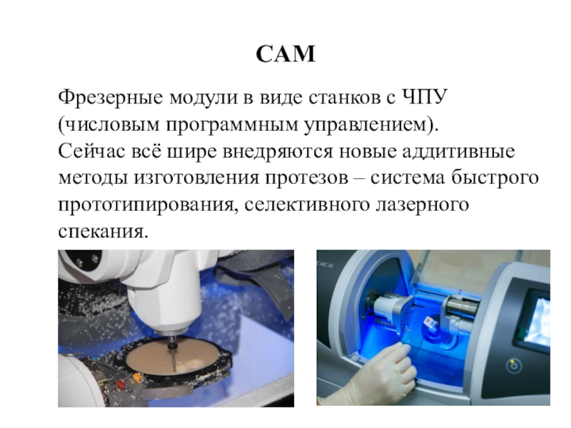 CAMФрезерные модули в виде станков с ЧПУ (числовым программным управлением).Сейчас всё шире внедряются новые аддитивные методы изготовления