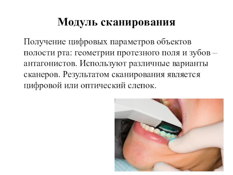 Модуль сканированияПолучение цифровых параметров объектов полости рта: геометрии протезного поля и зубов –антагонистов. Используют различные варианты сканеров.