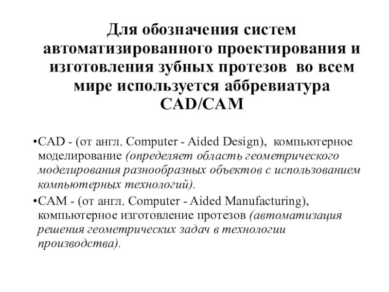 Слайд 3Для обозначения систем автоматизированного проектирования и изготовления зубных протезов во всем
