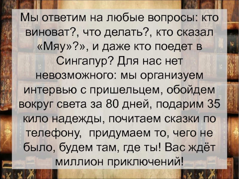 «Мяу»?», и даже кто поедет в Сингапур? Для нас нет невозможного: мы организуем интервью с пришельцем, обойдем вокруг света за 80 дней, подарим 35 кило надежды, почитаем сказки по телефону, придумаем то, чего не было, будем там, где ты! Вас ждёт миллион приключений!