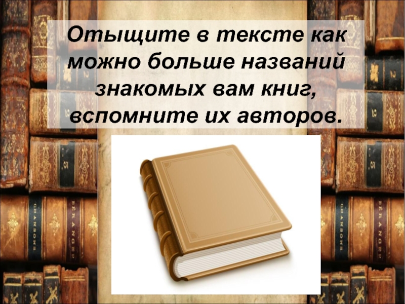 Слайд 3Отыщите в тексте как можно больше названий знакомых вам книг, вспомните