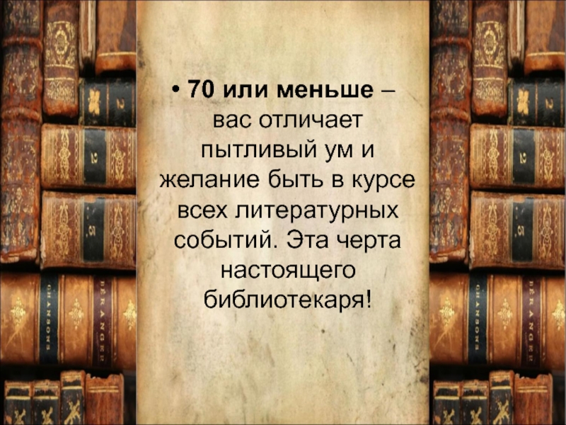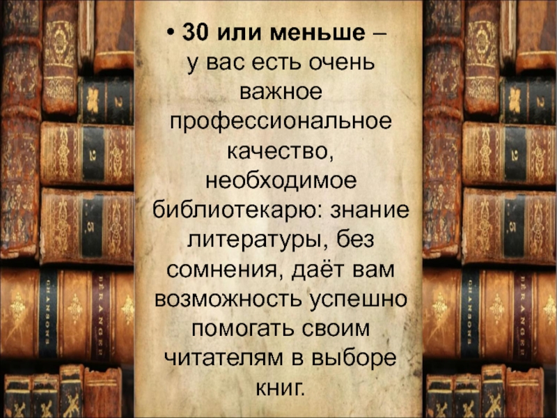есть очень важное профессиональное качество, необходимое библиотекарю: знание литературы, без сомнения, даёт вам возможность успешно помогать своим читателям в выборе книг.