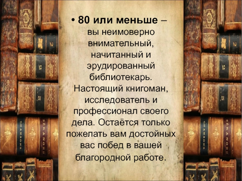 достойный библиотекарь. Пообщаться с вами – мечта каждого любителя и ценителя книг.