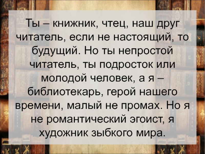 будущий. Но ты непростой читатель, ты подросток или молодой человек, а я – библиотекарь, герой нашего времени, малый не промах. Но я не романтический эгоист, я художник зыбкого мира.