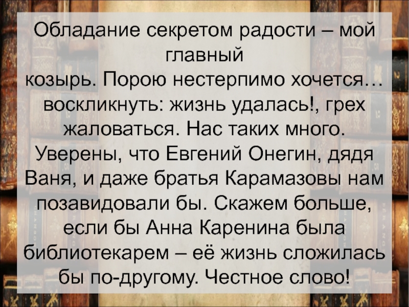 жизнь удалась!, грех жаловаться. Нас таких много. Уверены, что Евгений Онегин, дядя Ваня, и даже братья Карамазовы нам позавидовали бы. Скажем больше, если бы Анна Каренина была библиотекарем – её жизнь сложилась бы по-другому. Честное слово!