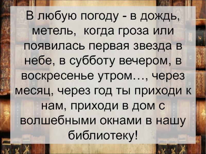 первая звезда в небе, в субботу вечером, в воскресенье утром…, через месяц, через год ты приходи к нам, приходи в дом с волшебными окнами в нашу библиотеку!