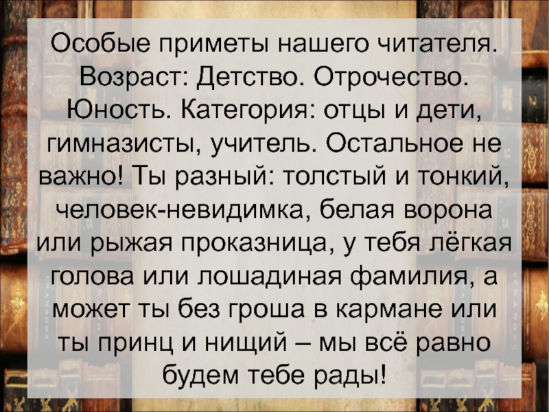 дети, гимназисты, учитель. Остальное не важно! Ты разный: толстый и тонкий, человек-невидимка, белая ворона или рыжая проказница, у тебя лёгкая голова или лошадиная фамилия, а может ты без гроша в кармане или ты принц и нищий – мы всё равно будем тебе рады!