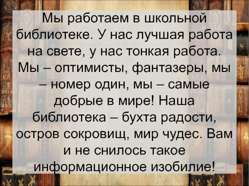 Слайд 7Мы работаем в школьной библиотеке. У нас лучшая работа на свете,