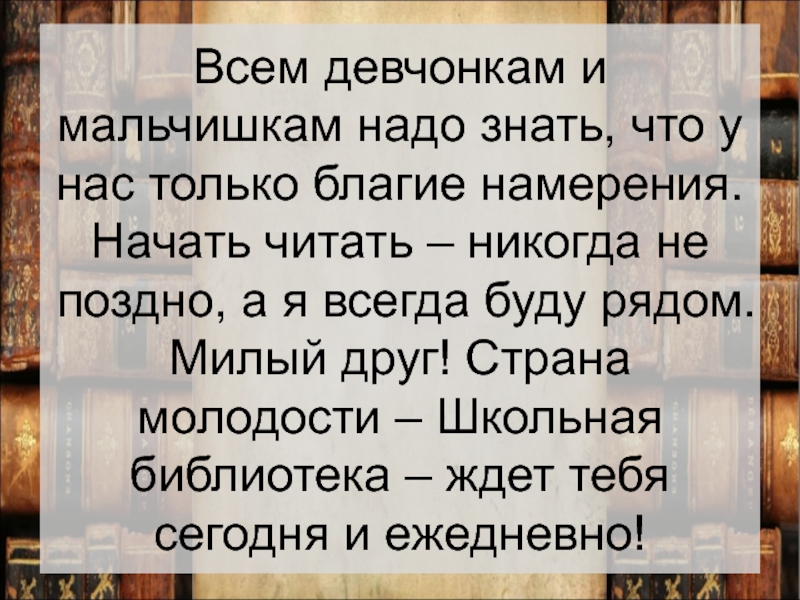 Начать читать – никогда не поздно, а я всегда буду рядом. Милый друг! Страна молодости – Школьная библиотека – ждет тебя сегодня и ежедневно!