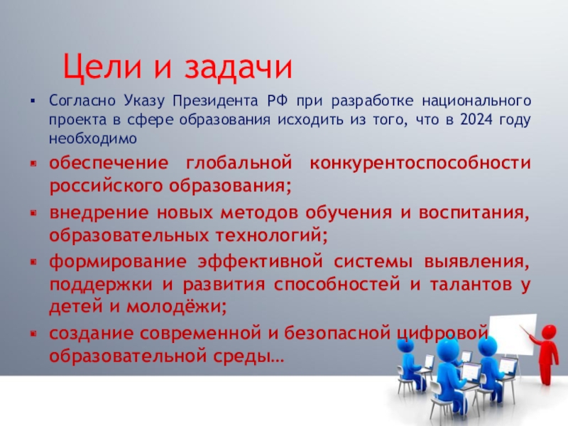 Цели и задачиСогласно Указу Президента РФ при разработке национального проекта в сфере образования исходить из того, что