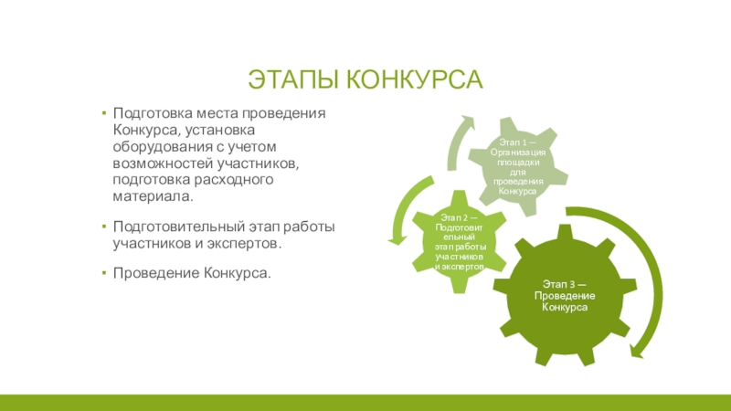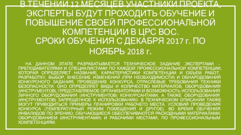 На данном этапе разрабатывается техническое задание экспертами - преподавателями и специалистами по каждой профессиональной компетенции, которая определяет название, характеристики компетенции и объем работ, разработку, выбор, внесение изменений (при необходимости) и обнародования Конкурсного задания, проведение Конкурса, отраслевые требования техники безопасности. Оно определяет виды и количество материалов, оборудования (инструментов), представляемое организаторами и возможность использования личного оборудования (инструментов) конкурсантами, а также оборудования (инструментов) запрещенное к использованию. В Техническом описании также могут приводиться примеры планировки рабочего места, условий проведения Конкурса (температурный режим помещения и другое). Во время обучения инвалидов по зрению, обучающиеся обеспечиваются расходными материалами, оборудованием (инструментами) и рабочими местами, по профессиональным компетенциям.
