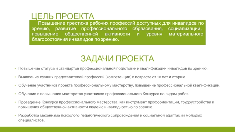 Повышение статуса и стандартов профессиональной подготовки и квалификации инвалидов по зрению.