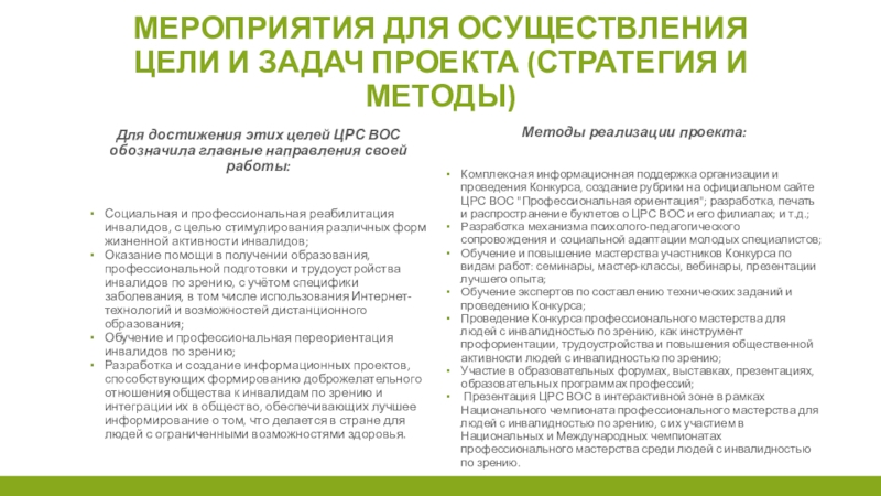 Комплексная информационная поддержка организации и проведения Конкурса, создание рубрики на официальном сайте ЦРС ВОС "Профессиональная ориентация"; разработка, печать и распространение буклетов о ЦРС ВОС и его филиалах; и т.д.;