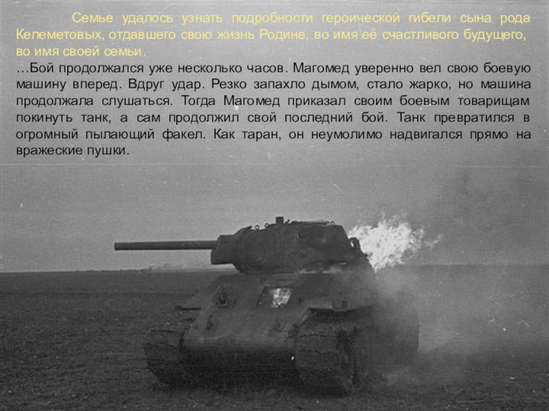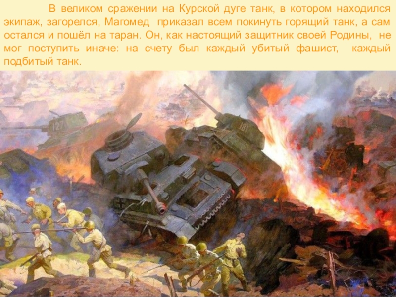 …Бой продолжался уже несколько часов. Магомед уверенно вел свою боевую машину вперед. Вдруг удар. Резко запахло дымом, стало жарко, но машина продолжала слушаться. Тогда Магомед приказал своим боевым товарищам покинуть танк, а сам продолжил свой последний бой. Танк превратился в огромный пылающий факел. Как таран, он неумолимо надвигался прямо на вражеские пушки.
