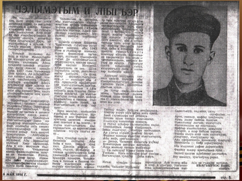 в тысяча девятьсот сорок третьем году в танковом сражении под Прохоровкой. В письме к матери командир части рассказал, что Мухамед повторил подвиг Николая Гастелло на земле.
