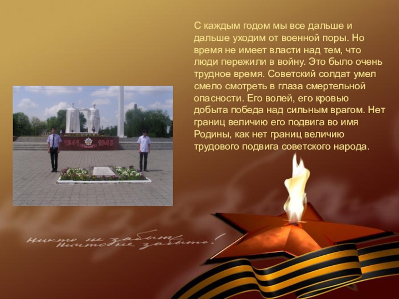 поры. Но время не имеет власти над тем, что люди пережили в войну. Это было очень трудное время. Советский солдат умел смело смотреть в глаза смертельной опасности. Его волей, его кровью добыта победа над сильным врагом. Нет границ величию его подвига во имя Родины, как нет границ величию трудового подвига советского народа.