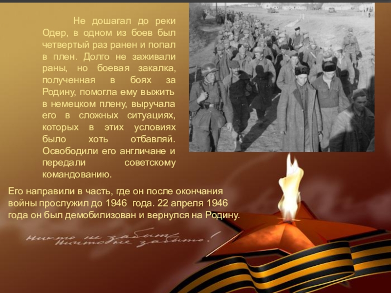 боев был четвертый раз ранен и попал в плен. Долго не заживали раны, но боевая закалка, полученная в боях за Родину, помогла ему выжить в немецком плену, выручала его в сложных ситуациях, которых в этих условиях было хоть отбавляй. Освободили его англичане и передали советскому командованию.