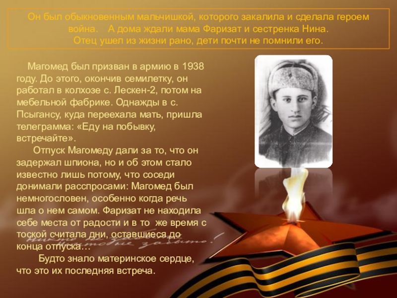 Магомед был призван в армию в 1938 году. До этого, окончив семилетку, он работал в колхозе с. Лескен-2, потом на мебельной фабрике. Однажды в с. Псыгансу, куда переехала мать, пришла телеграмма: «Еду на побывку, встречайте».