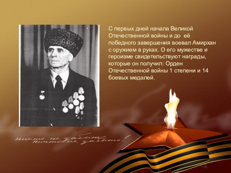 завершения воевал Амирхан с оружием в руках. О его мужестве и героизме свидетельствуют награды, которые он получил: Орден Отечественной войны 1 степени и 14 боевых медалей.