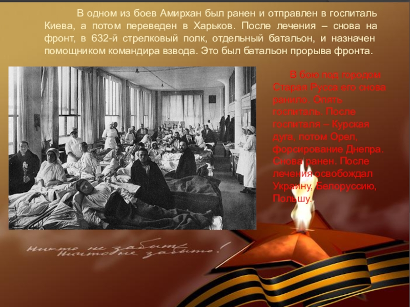 В одном из боев Амирхан был ранен и отправлен в госпиталь Киева, а потом переведен в Харьков. После лечения – снова на фронт, в 632-й стрелковый полк, отдельный батальон, и назначен помощником командира взвода. Это был батальон прорыва фронта.