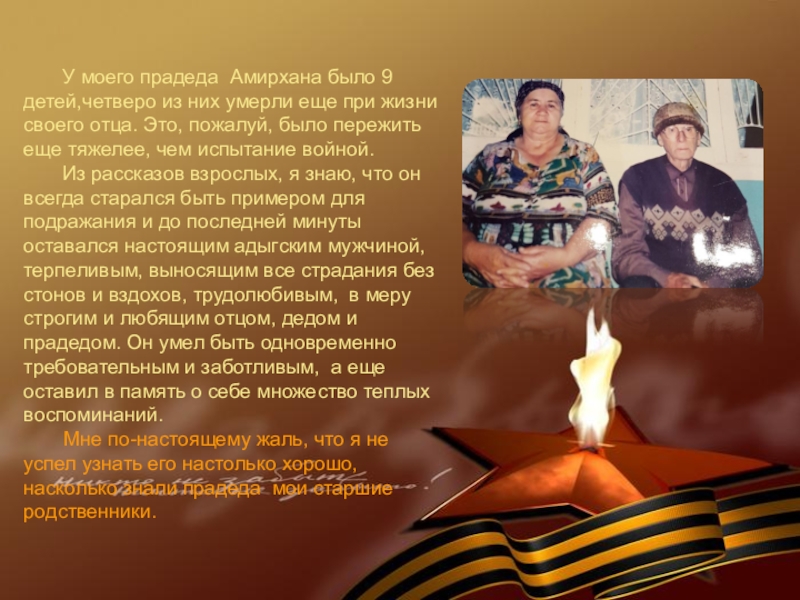 Из рассказов взрослых, я знаю, что он всегда старался быть примером для подражания и до последней минуты оставался настоящим адыгским мужчиной, терпеливым, выносящим все страдания без стонов и вздохов, трудолюбивым, в меру строгим и любящим отцом, дедом и прадедом. Он умел быть одновременно требовательным и заботливым, а еще оставил в память о себе множество теплых воспоминаний.